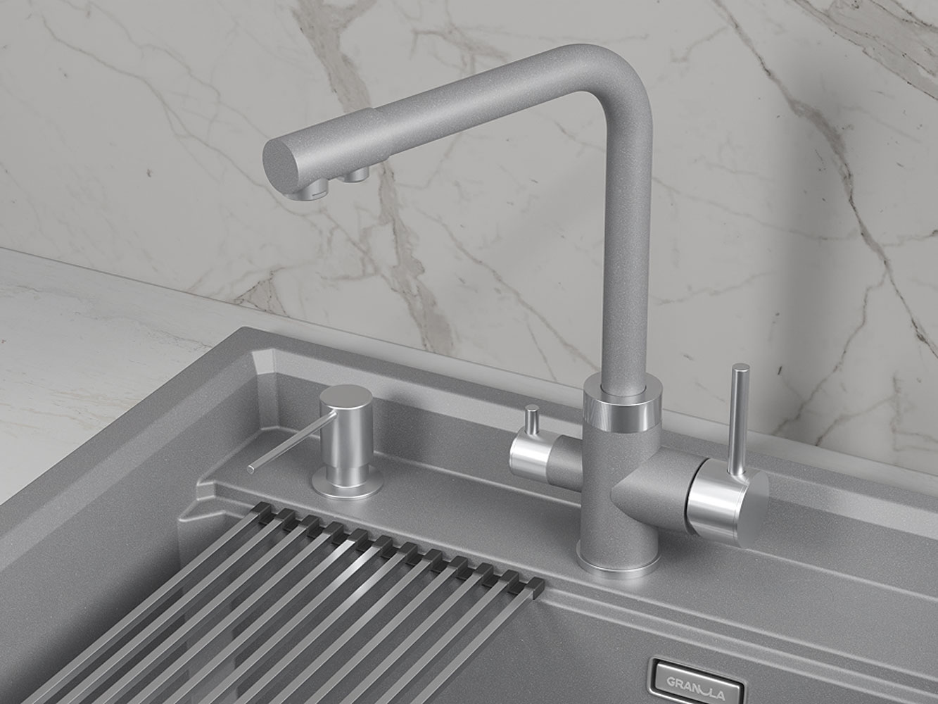 • Смеситель GR-5015 станет идеальным дополнением современной кухни. Аксессуар сочетает удобство и стильный дизайн. Нержавеющая сталь обеспечивает долговечность и защиту от коррозии. Управление с помощью рычага позволяет легко регулировать напор и температуру воды. Поворотный излив добавляет элегантности и подходит под разные стили интерьера.