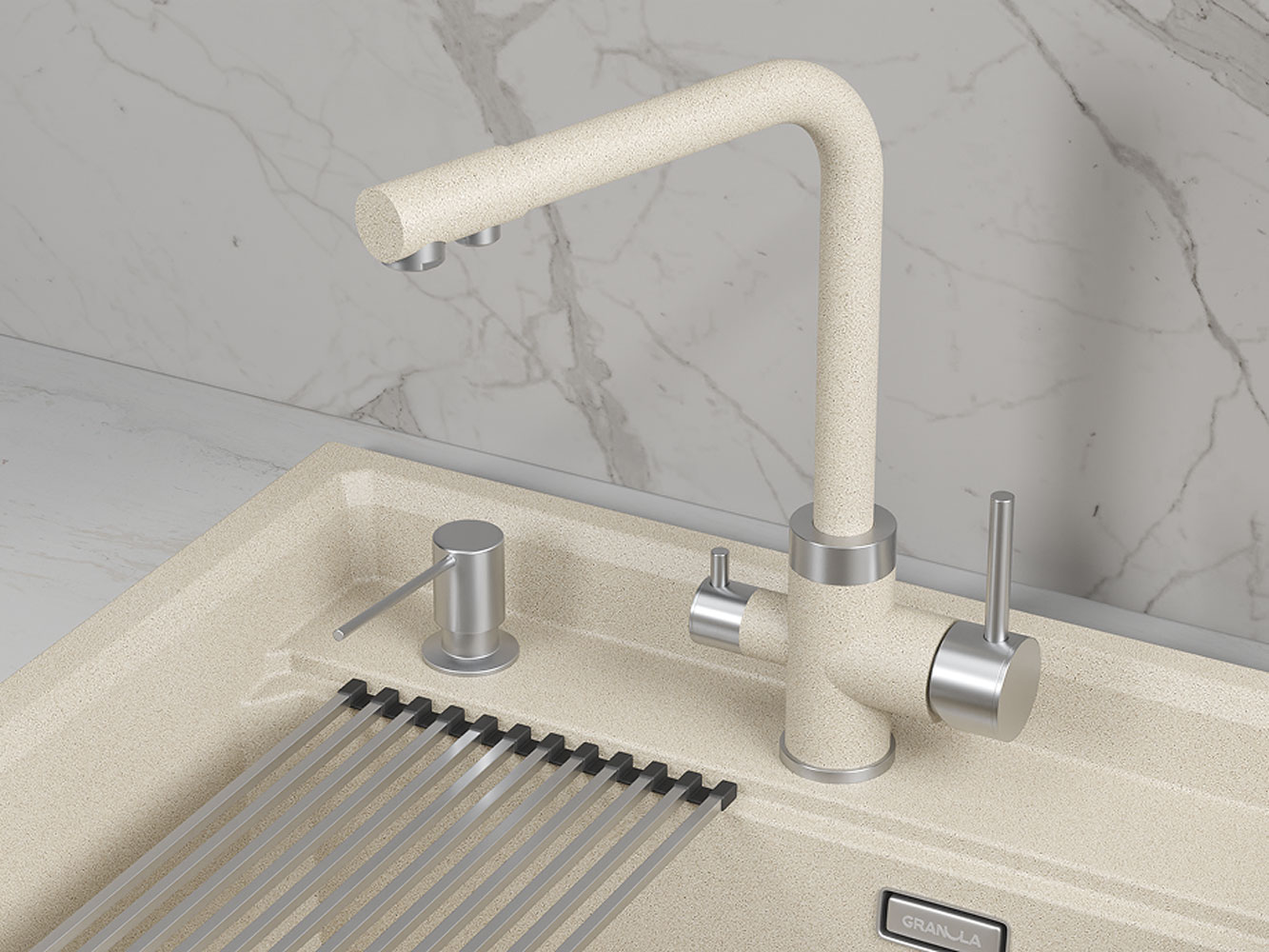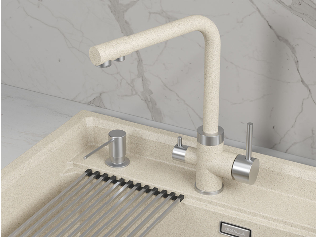 • Смеситель GR-5015 станет идеальным дополнением современной кухни. Аксессуар сочетает удобство и стильный дизайн. Нержавеющая сталь обеспечивает долговечность и защиту от коррозии. Управление с помощью рычага позволяет легко регулировать напор и температуру воды. Поворотный излив добавляет элегантности и подходит под разные стили интерьера.