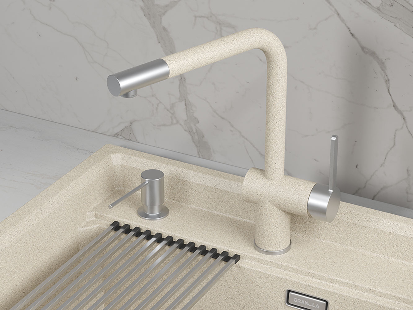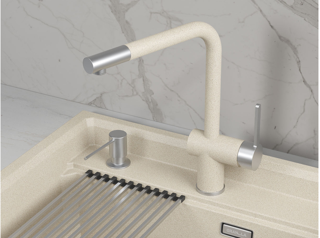• Смеситель GR-5017 станет стильным и функциональным помощником на кухне. Нержавеющая сталь гарантирует долговечность и устойчивость к постоянному воздействию влаги. Поворотный излив и рычажное управление обеспечивают удобство эксплуатации и возможность регулировки угла подачи воды. Стильный дизайн позволяет интегрировать аксессуар в любой стиль оформления.