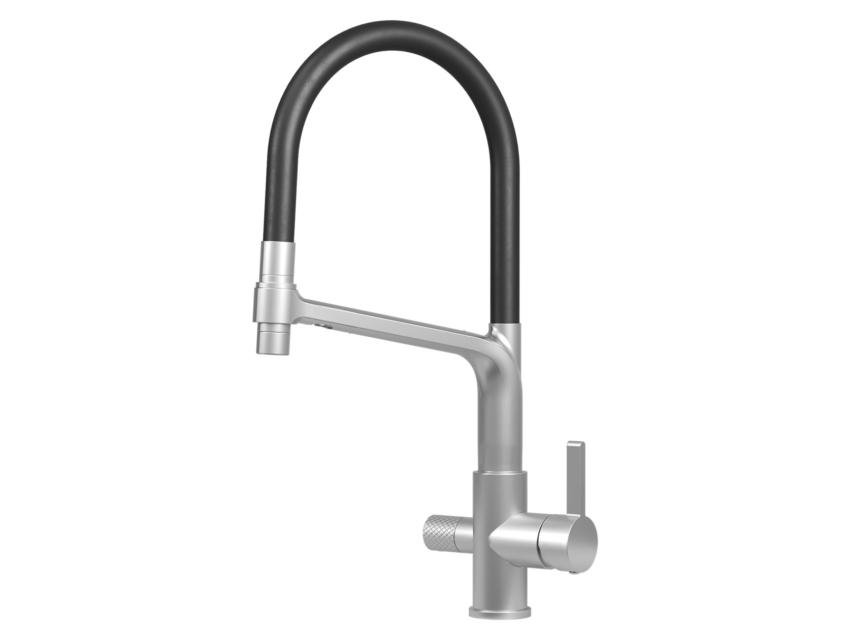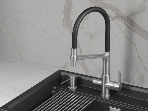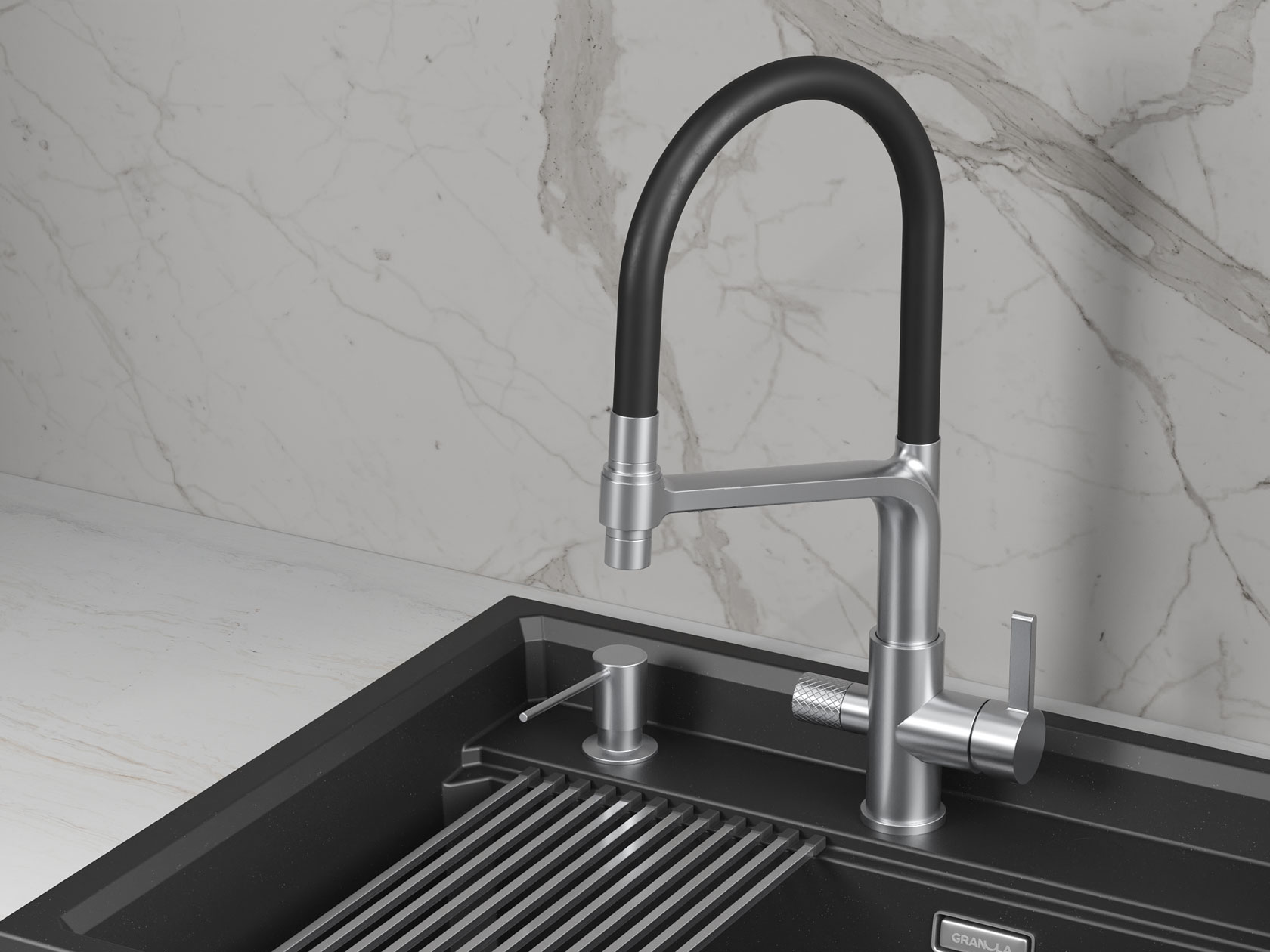 • Смеситель GR-5083 станет незаменимым дополнением современной кухни. Гибкий силиконовый излив позволяет направлять струю в любую точку мойки. Рычажное управление гарантирует плавную регулировку температуры и напора. Два режима подачи — струя и душ — легко переключаются с помощью поворота лейки. Аксессуар оснащен встроенным каналом для подключения к фильтру, чтобы обеспечить чистую питьевую воду. Керамический картридж гарантирует долгий срок службы.