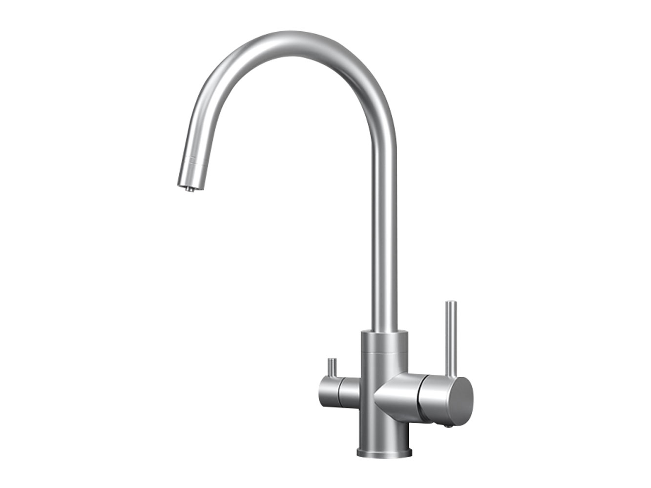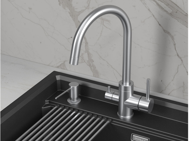 • Смеситель GR-5169 — идеальное сочетание элегантности и практичности. Надежный материал гарантирует долговечность и защиту от коррозии. Удобный рычаг позволяет плавно регулировать напор и температуру воды. Особенность аксессуара — интеграция с системой фильтрации, которая дает возможность переключаться между водопроводной и фильтрованной водой. Керамический картридж обеспечивает точную настройку и долгий срок службы.