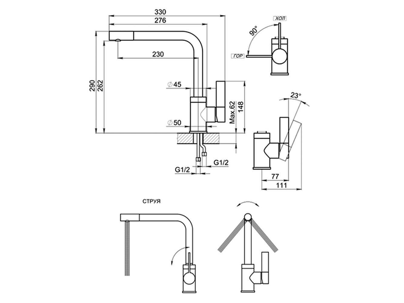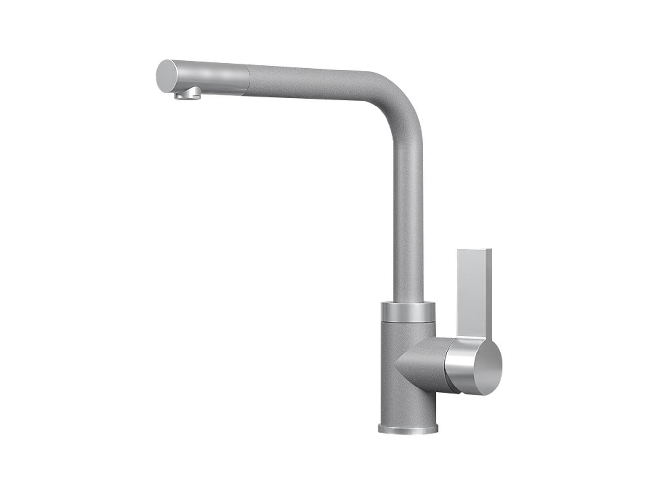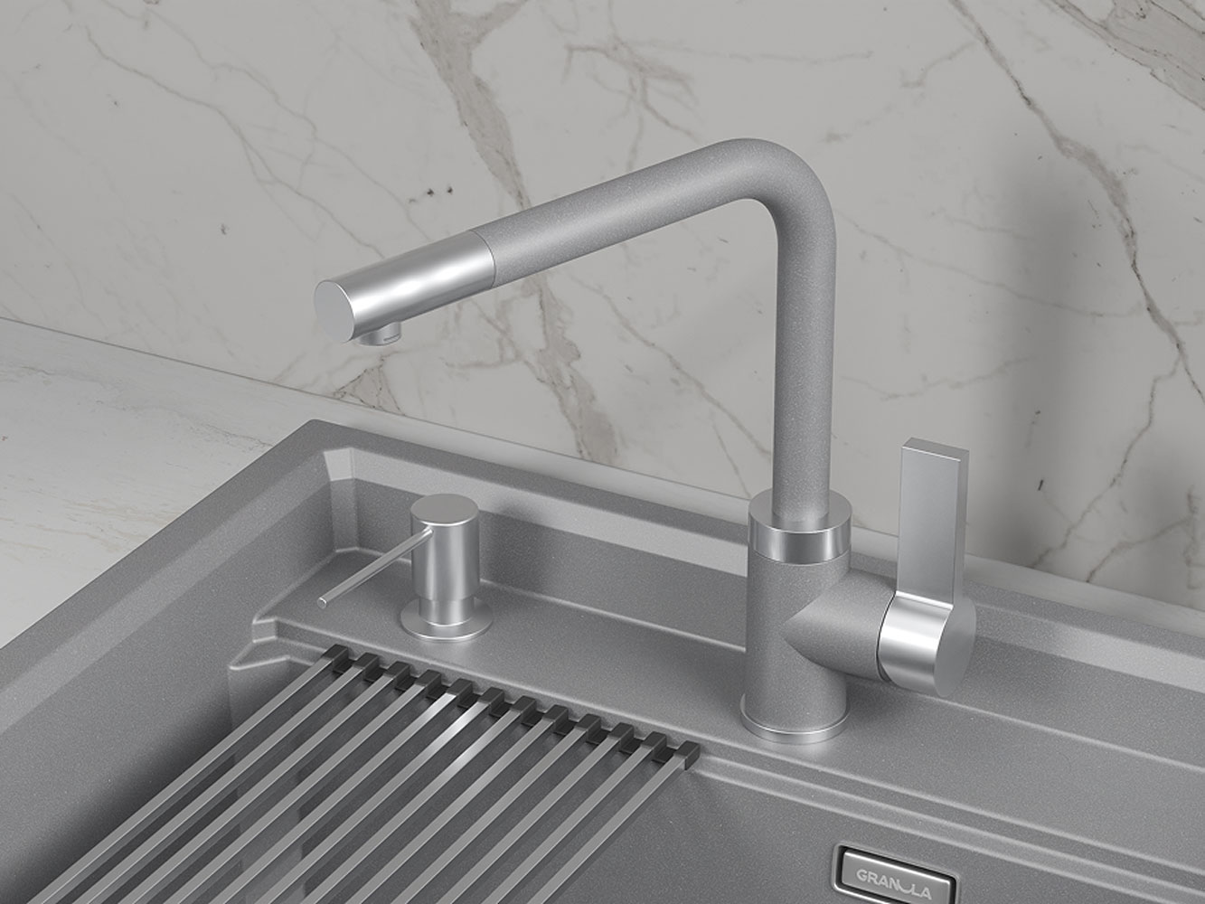 • Смеситель GR-5504 — воплощение современного дизайна и надежности. Нержавеющая сталь гарантирует долговечность и устойчивость к коррозии. Удобный рычаг плавно регулирует напор и температуру воды, а высокий поворотный излив облегчает мытье посуды и наполнение крупногабаритных емкостей. Керамический картридж обеспечивает долгий срок службы аксессуара.