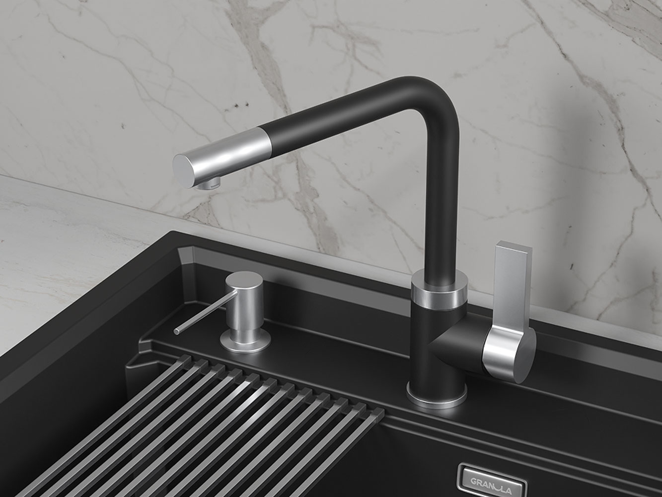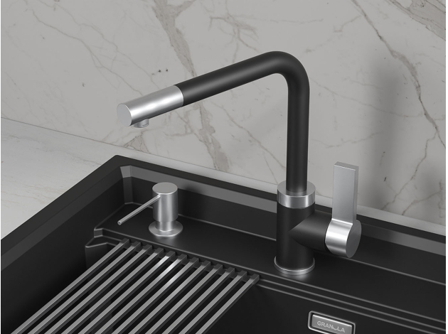 • Смеситель GR-5504 — воплощение современного дизайна и надежности. Нержавеющая сталь гарантирует долговечность и устойчивость к коррозии. Удобный рычаг плавно регулирует напор и температуру воды, а высокий поворотный излив облегчает мытье посуды и наполнение крупногабаритных емкостей. Керамический картридж обеспечивает долгий срок службы аксессуара.