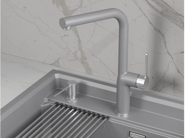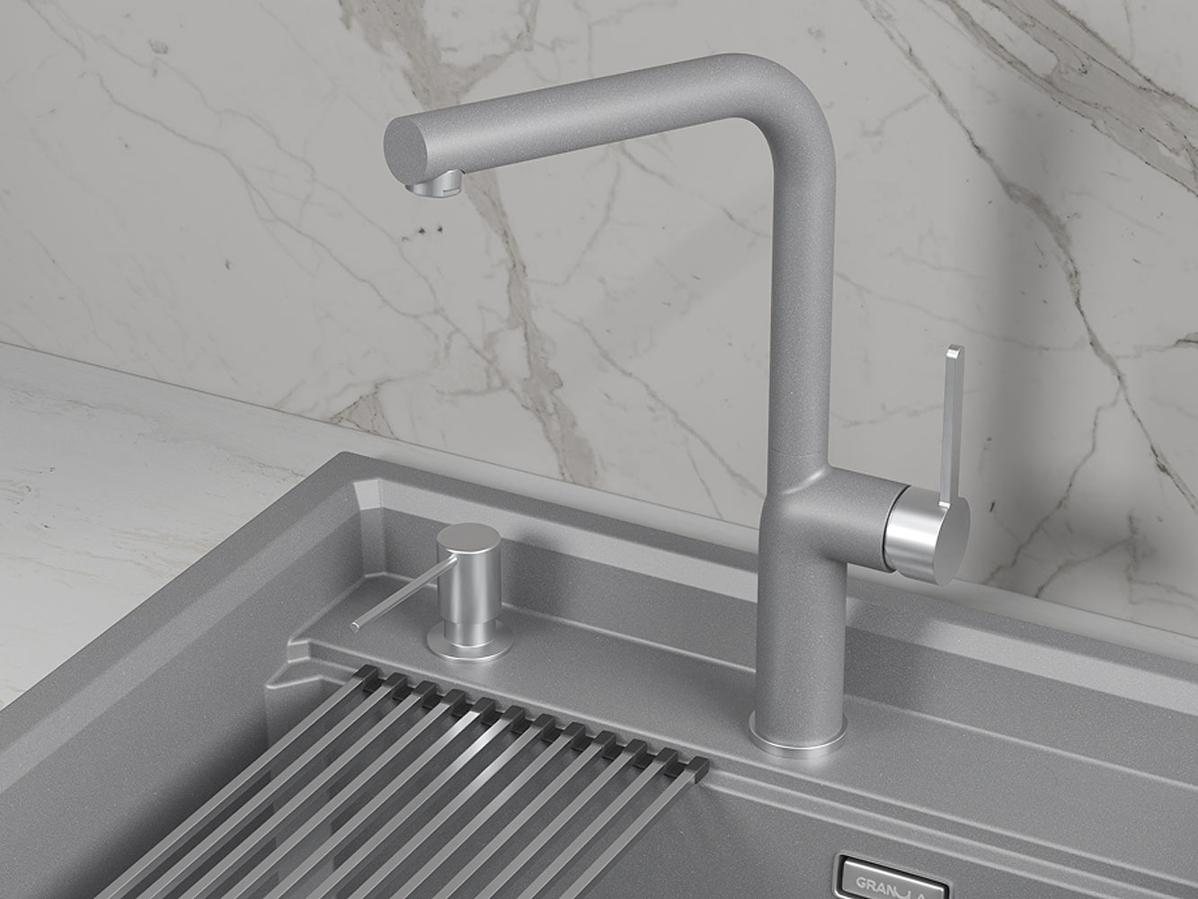 • Смеситель GR-9502 отличается удобным рычажным управлением и высоким поворотным изливом, что позволяет легко регулировать поток воды. Габариты идеально подходят для большинства кухонных столешниц. С помощью рычага можно плавно настраивать температуру воды. Матовое покрытие облегчает уход, скрывая следы брызг.