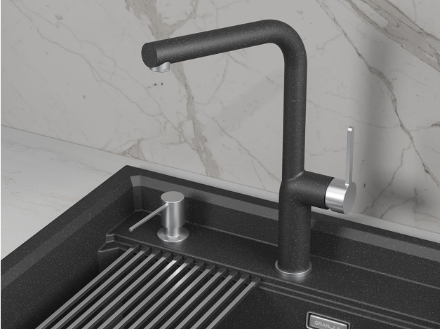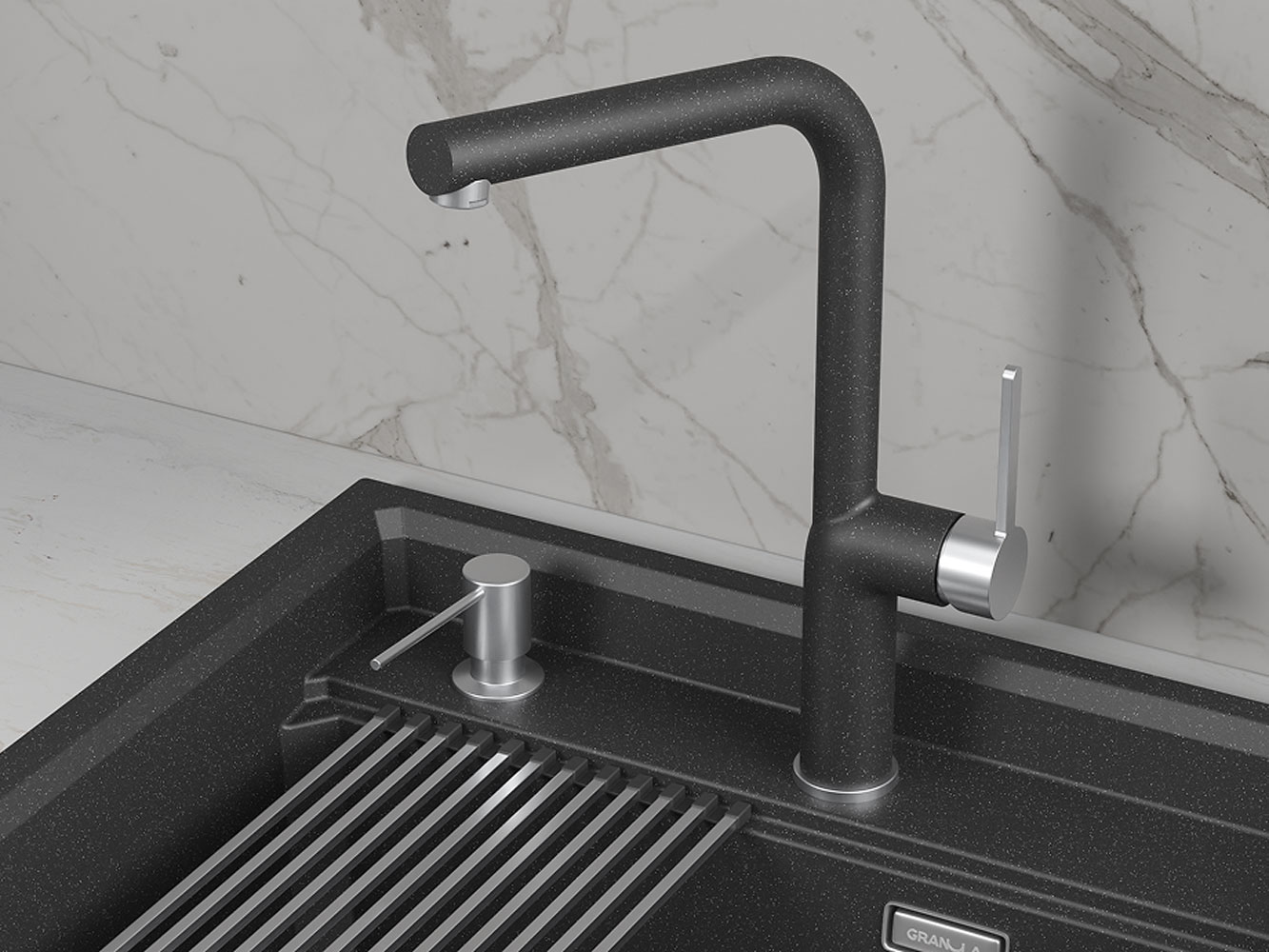 • Смеситель GR-9502 отличается удобным рычажным управлением и высоким поворотным изливом, что позволяет легко регулировать поток воды. Габариты идеально подходят для большинства кухонных столешниц. С помощью рычага можно плавно настраивать температуру воды. Матовое покрытие облегчает уход, скрывая следы брызг.