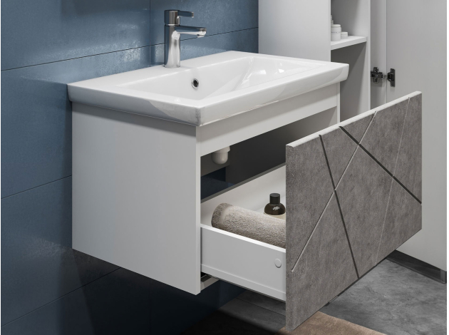 • Комплект мебели для ванной Геометрия станет практичным решением для небольшого пространства, где на счету каждый сантиметр. Компактная подвесная тумба оснащена вместительным выдвижным ящиком для хранения бытовых мелочей и косметики. Качественные материалы и фурнитура обеспечивают комфортную эксплуатацию. Матовые фасады с геометрическими линиями добавляют интерьеру динамики.