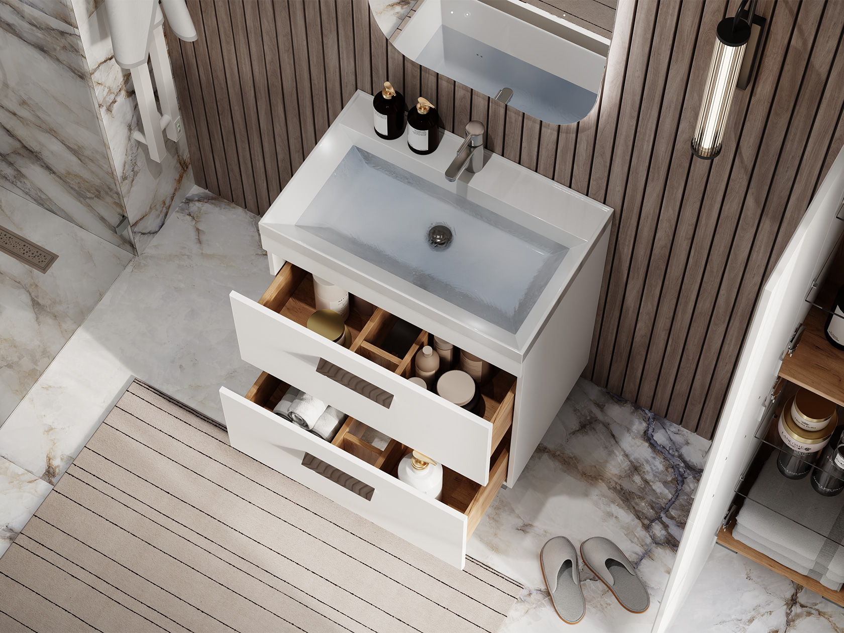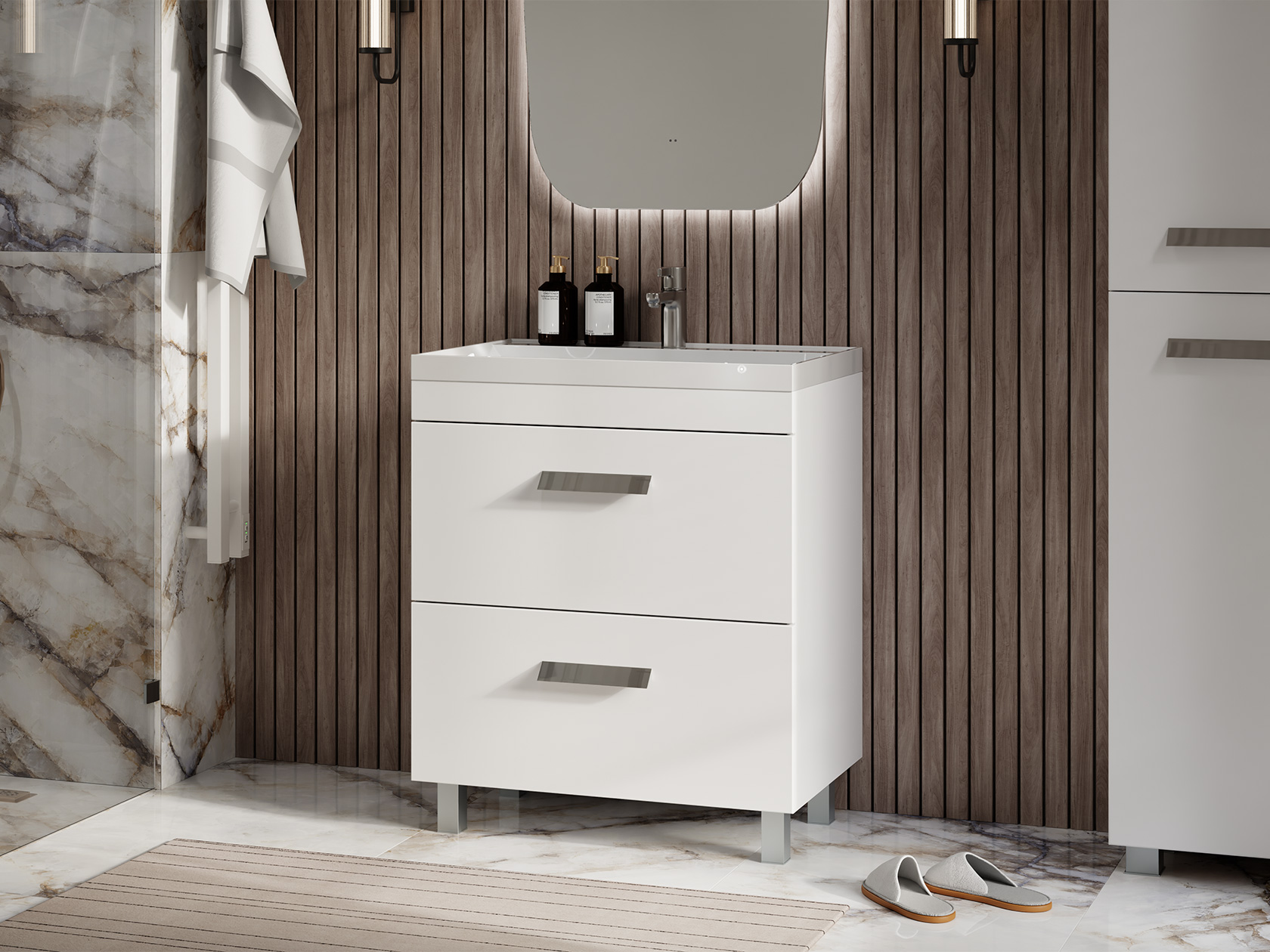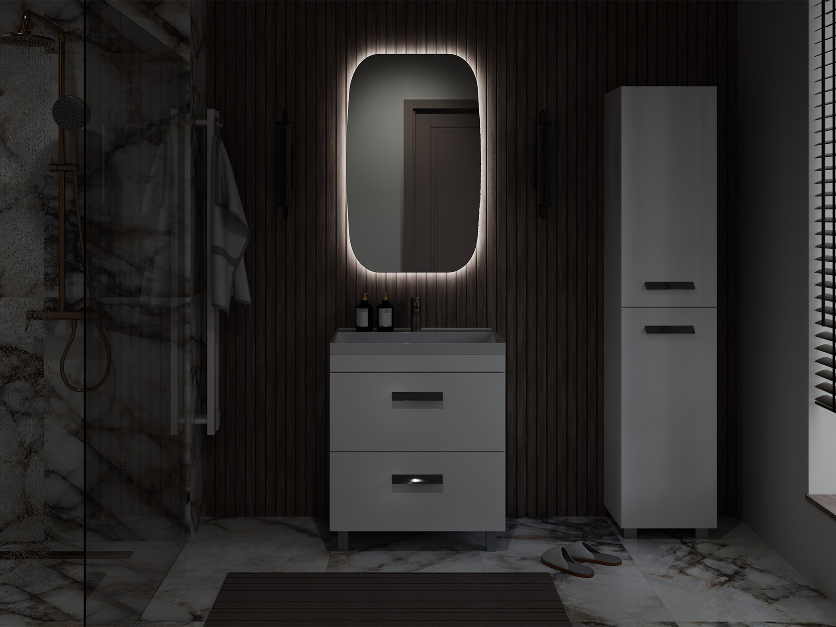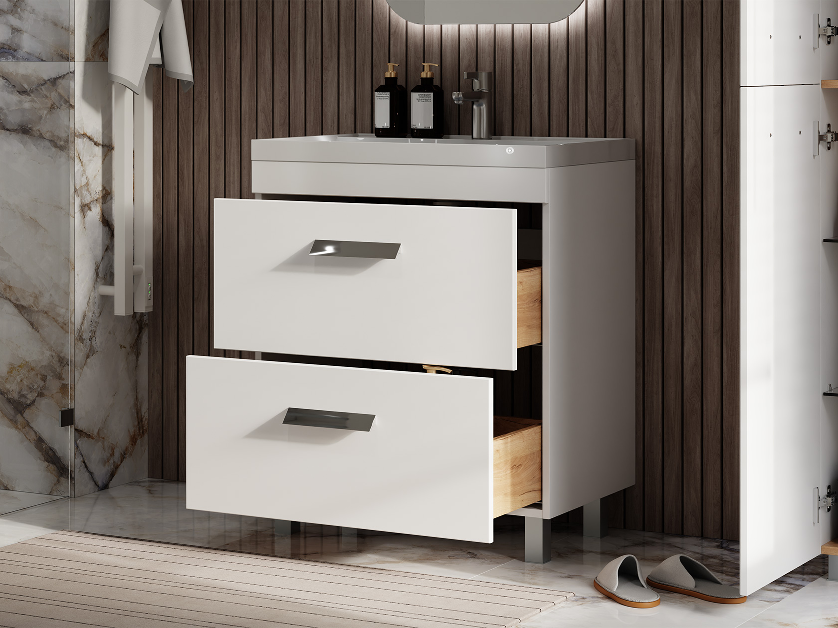 Комплект мебели для ванной Орландо Флэш — идеальное сочетание функциональности и современного дизайна. Стильная напольная тумба и раковина гармонично дополняют друг друга. Благодаря выдвижным ящикам и полкам пенала удается легко поддерживать порядок среди полотенец, косметических и моющих средств, а также аксессуаров.