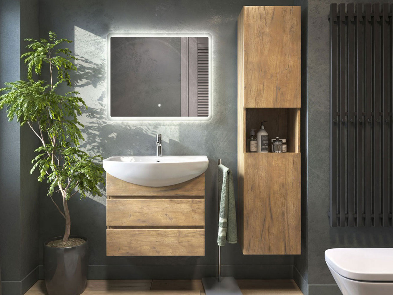 Комплект мебели для ванной Винг — стильное решение для обустройства современного интерьера. Навесные элементы экономят пространство на полу. Поверхность не портится от влаги и без лишних усилий очищается от загрязнений. Зеркало с LED-подсветкой делает помещение визуально просторнее, а включение одним взмахом дарит удобство в эксплуатации.