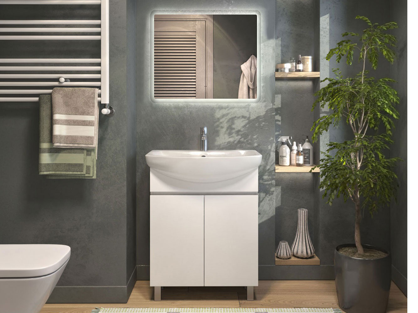 Комплект мебели для ванной Винг Дуо идеально подходит для небольшой комнаты. Удобная тумба и LED-зеркало с подсветкой создают комфорт и визуально расширяют пространство. Лаконичный дизайн с гладкими фасадами удачно сочетается с разными интерьерными решениями. Материалы устойчивы к влаге и легко очищаются от загрязнений.