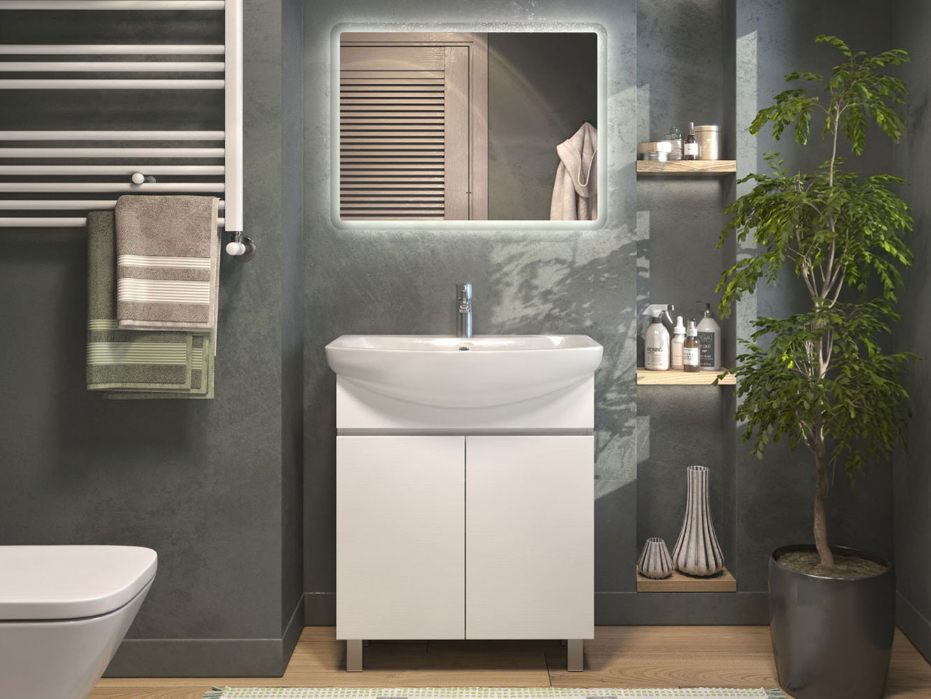 Комплект мебели для ванной Винг Дуо идеально подходит для небольшой комнаты. Удобная тумба и LED-зеркало с подсветкой создают комфорт и визуально расширяют пространство. Лаконичный дизайн с гладкими фасадами удачно сочетается с разными интерьерными решениями. Материалы устойчивы к влаге и легко очищаются от загрязнений.