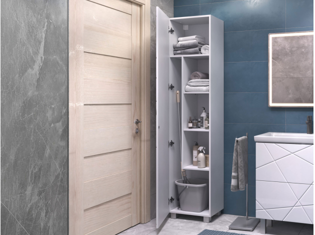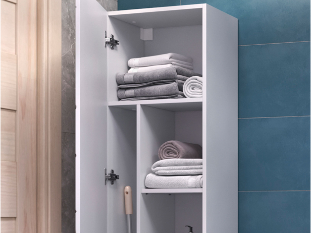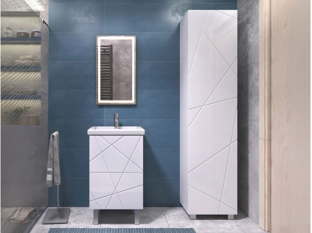 • Шкаф-пенал Геометрия сочетает стиль и практичность. Фасад с трендовым узором придает мебели эффектный вид, а влагостойкие материалы обеспечивают долговечность. Внутри предусмотрены полки для хранения полотенец, бытовой химии или косметики. Регулируемые опоры дарят конструкции устойчивость и облегчают уборку.