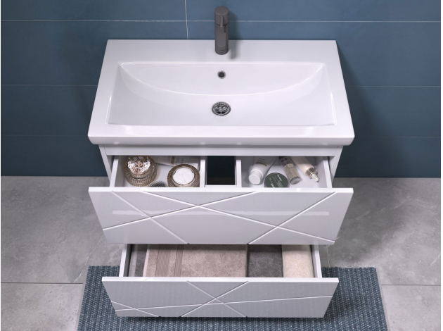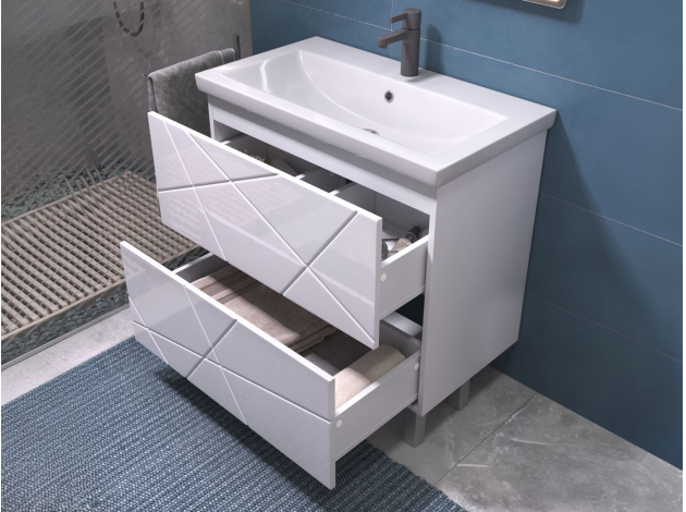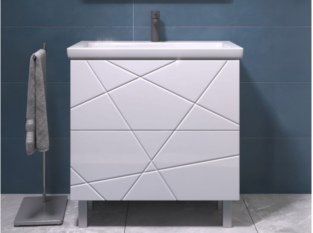 Напольная тумба под раковину Геометрия — стильный и практичный элемент ванной комнаты. Трендовая фрезеровка добавляет интерьеру динамики. Модель оснащена двумя вместительными выдвижными ящиками с механизмом плавного закрывания. Внутри можно хранить предметы первой необходимости, косметику и бытовую химию. Регулируемые опоры придают конструкции устойчивость и облегчают уборку.