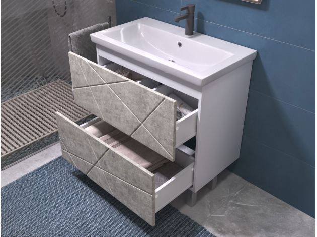 • Напольная тумба под раковину Геометрия — стильный и практичный элемент ванной комнаты. Трендовая фрезеровка добавляет интерьеру динамики. Модель оснащена двумя вместительными выдвижными ящиками с механизмом плавного закрывания. Внутри можно хранить предметы первой необходимости, косметику и бытовую химию. Регулируемые опоры придают конструкции устойчивость и облегчают уборку.