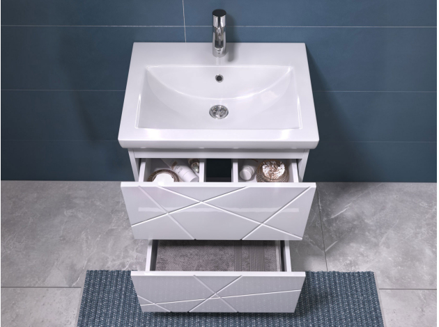 • Напольная тумба под раковину Геометрия — стильный и практичный элемент ванной комнаты. Трендовая фрезеровка добавляет интерьеру динамики. Модель оснащена двумя вместительными выдвижными ящиками с механизмом плавного закрывания. Внутри можно хранить предметы первой необходимости, косметику и бытовую химию. Регулируемые опоры придают конструкции устойчивость и облегчают уборку.