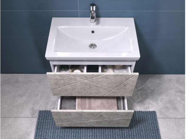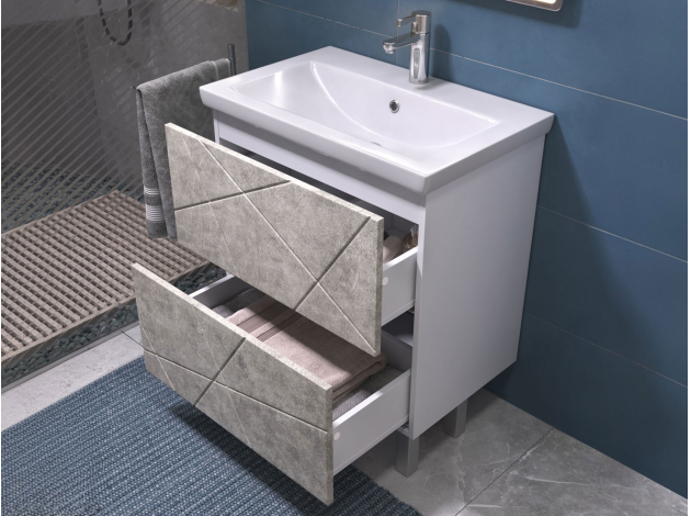 • Напольная тумба под раковину Геометрия — стильный и практичный элемент ванной комнаты. Трендовая фрезеровка добавляет интерьеру динамики. Модель оснащена двумя вместительными выдвижными ящиками с механизмом плавного закрывания. Внутри можно хранить предметы первой необходимости, косметику и бытовую химию. Регулируемые опоры придают конструкции устойчивость и облегчают уборку.