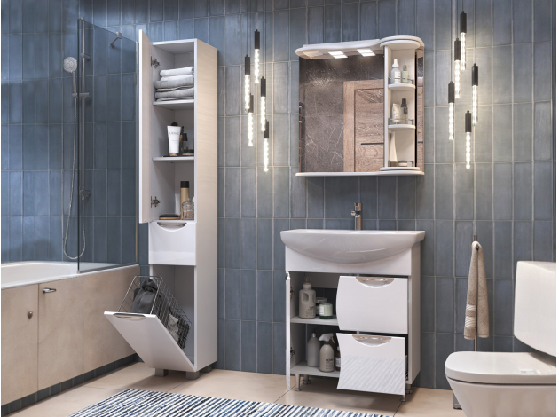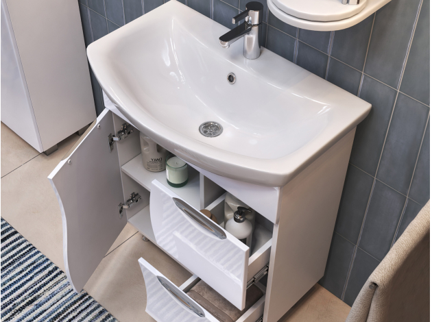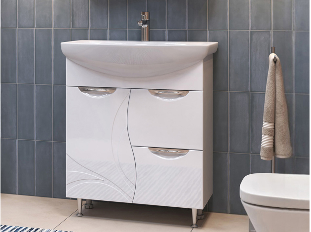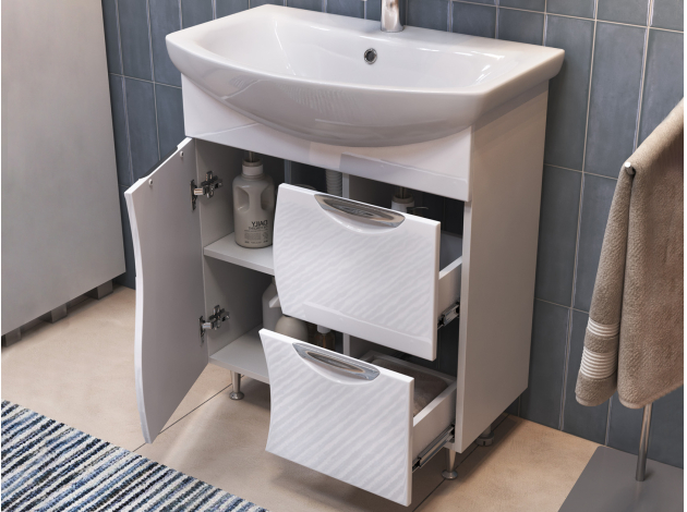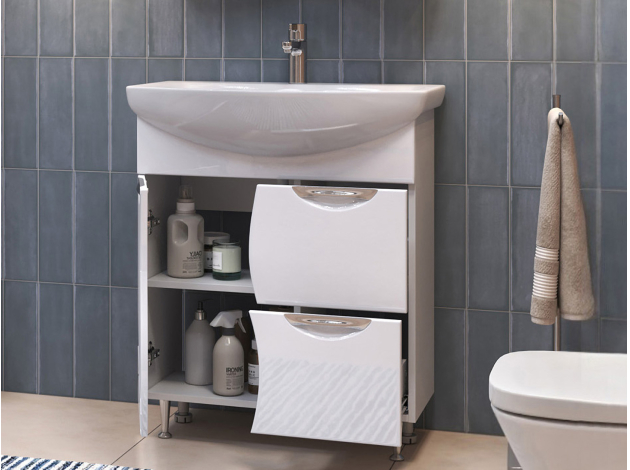 Тумба под раковину Каллао Комби добавит интерьеру ванной комнаты утонченный стиль. Фасады с плавными линиями и изящной фрезеровкой придают мебели элегантность. За распашной дверцей скрыто отделение для моющих средств, а в выдвижных ящиках удобно хранить различные мелочи. Хромированные ручки служат необычным акцентом в оформлении пространства.