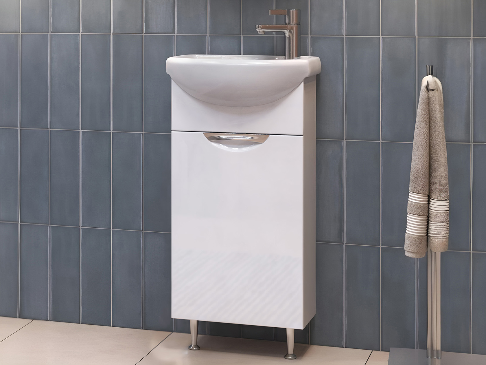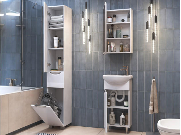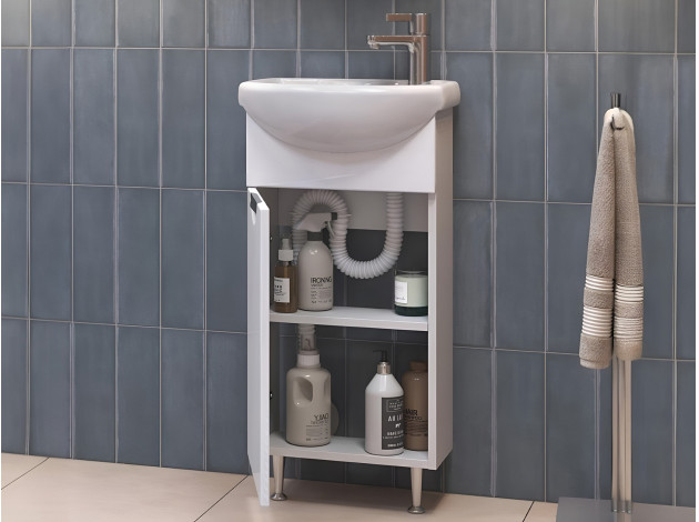 • Тумба под раковину Каллао 1 дверь — компактное решение для небольшой ванной комнаты. За глянцевым фасадом скрыта полка, где удобно хранить бытовую химию и аксессуары. Дверца закрывается практически бесшумно, а регулируемые опоры обеспечивают мебели устойчивость даже на полу с перепадами высоты.
