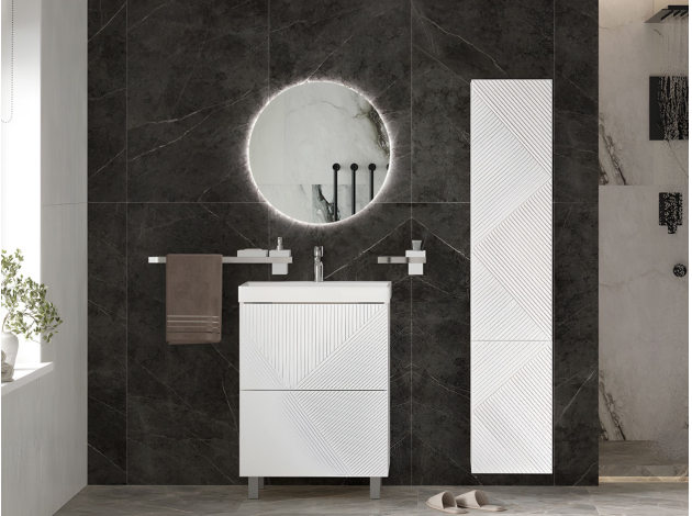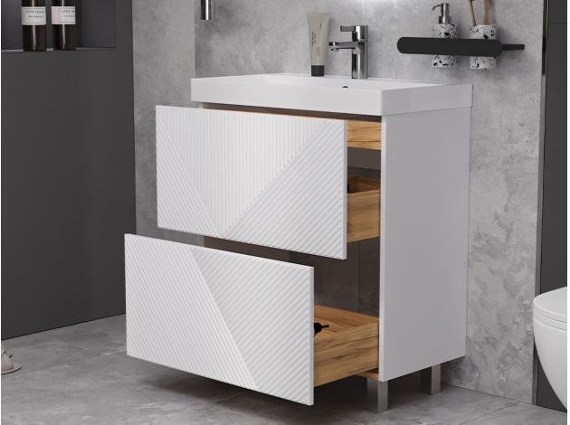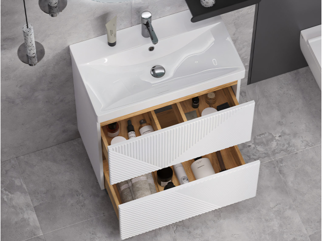 • Напольная тумба под раковину Эджи — стильное и практичное решение для ванной. Выдвижные ящики открываются легким нажатием и обеспечивают быстрый доступ к хранящимся внутри вещам. Оригинальные фасады с фрезеровкой добавляют изысканности, а отсутствие ручек поддерживает актуальный мебельный тренд.