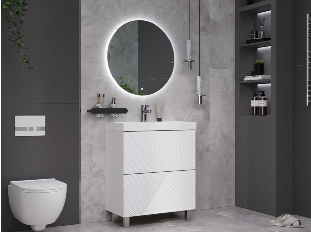 • Напольная тумба под раковину Эджи — стильное и практичное решение для ванной. Выдвижные ящики открываются легким нажатием и обеспечивают быстрый доступ к хранящимся внутри вещам. Оригинальные фасады с фрезеровкой добавляют изысканности, а отсутствие ручек поддерживает актуальный мебельный тренд.