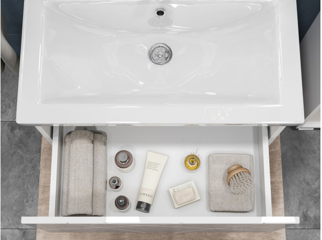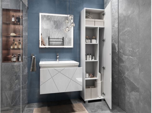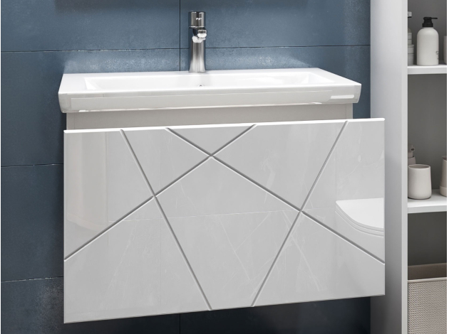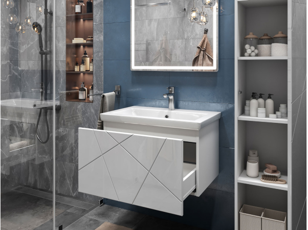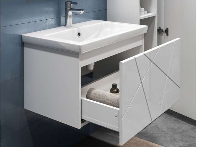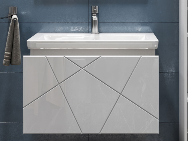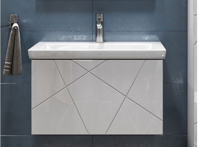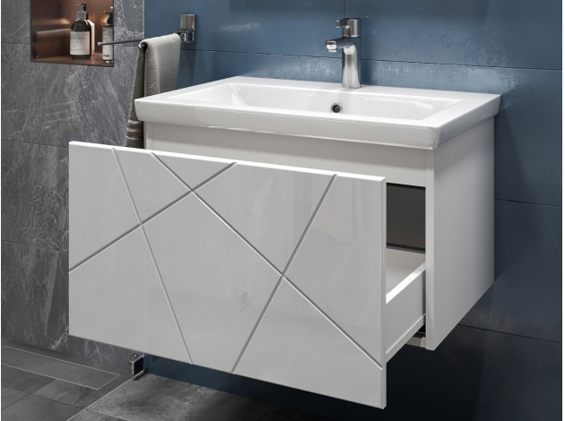 • Навесная тумба под раковину Геометрия добавит интерьеру стильный акцент благодаря трендовому узору фрезеровки. Просторный выдвижной ящик открывается плавно и бесшумно с помощью нажимного механизма. Компактные габариты и продуманная конструкция позволяют оптимально использовать обстановку ванной комнаты, не загромождая пространство на полу.