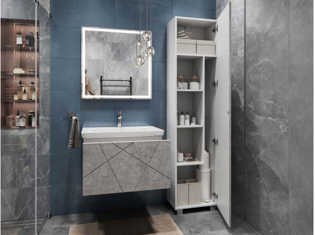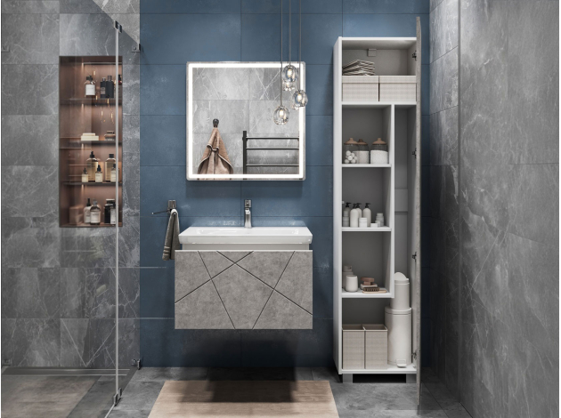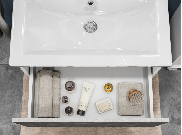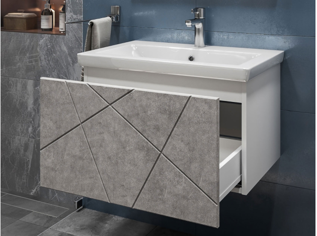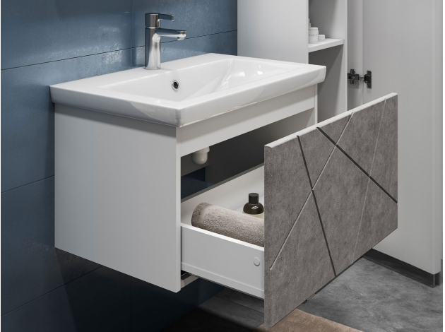 • Навесная тумба под раковину Геометрия добавит интерьеру стильный акцент благодаря трендовому узору фрезеровки. Просторный выдвижной ящик открывается плавно и бесшумно с помощью нажимного механизма. Компактные габариты и продуманная конструкция позволяют оптимально использовать обстановку ванной комнаты, не загромождая пространство на полу.