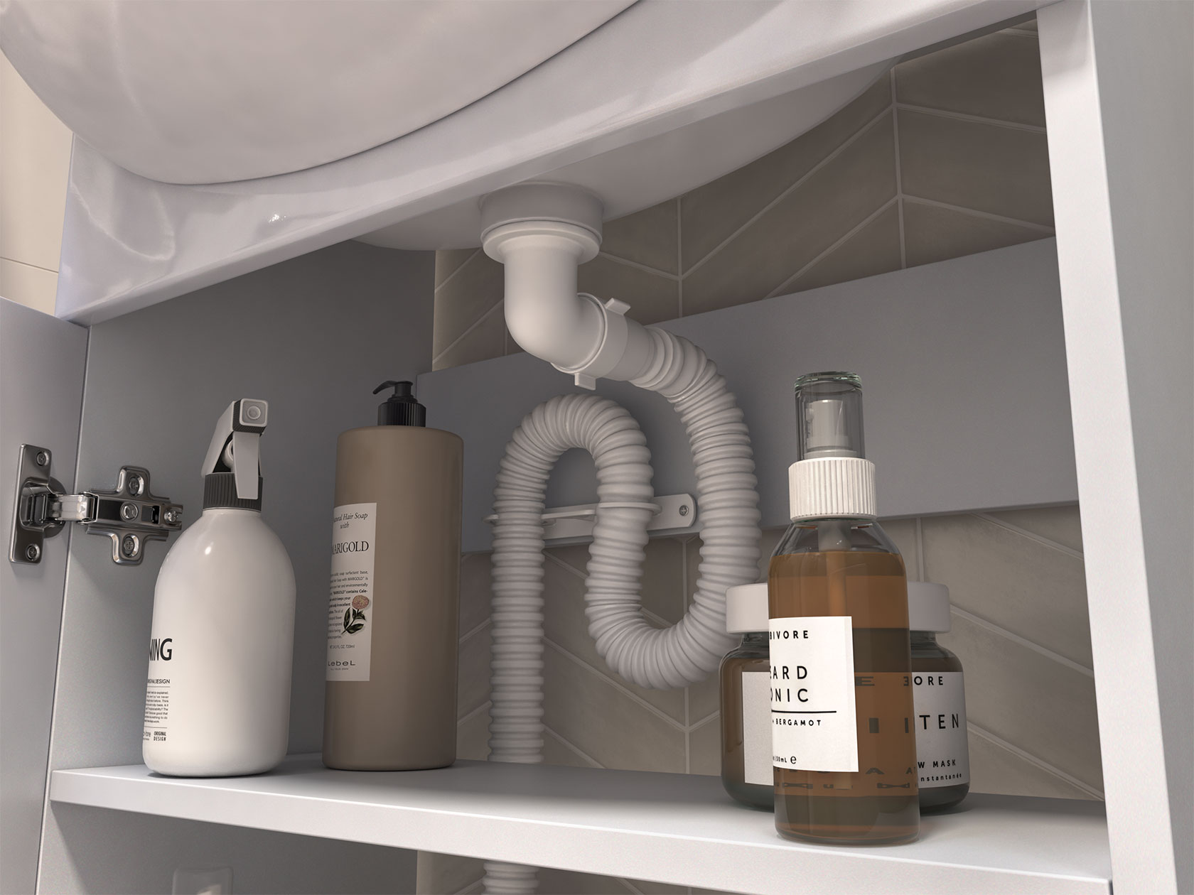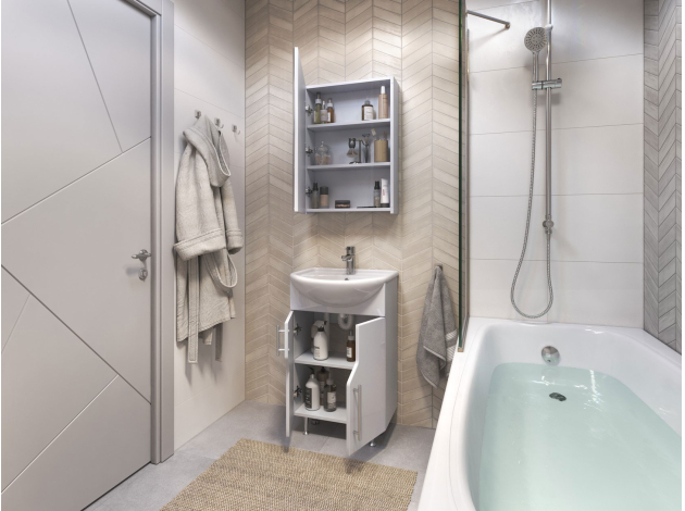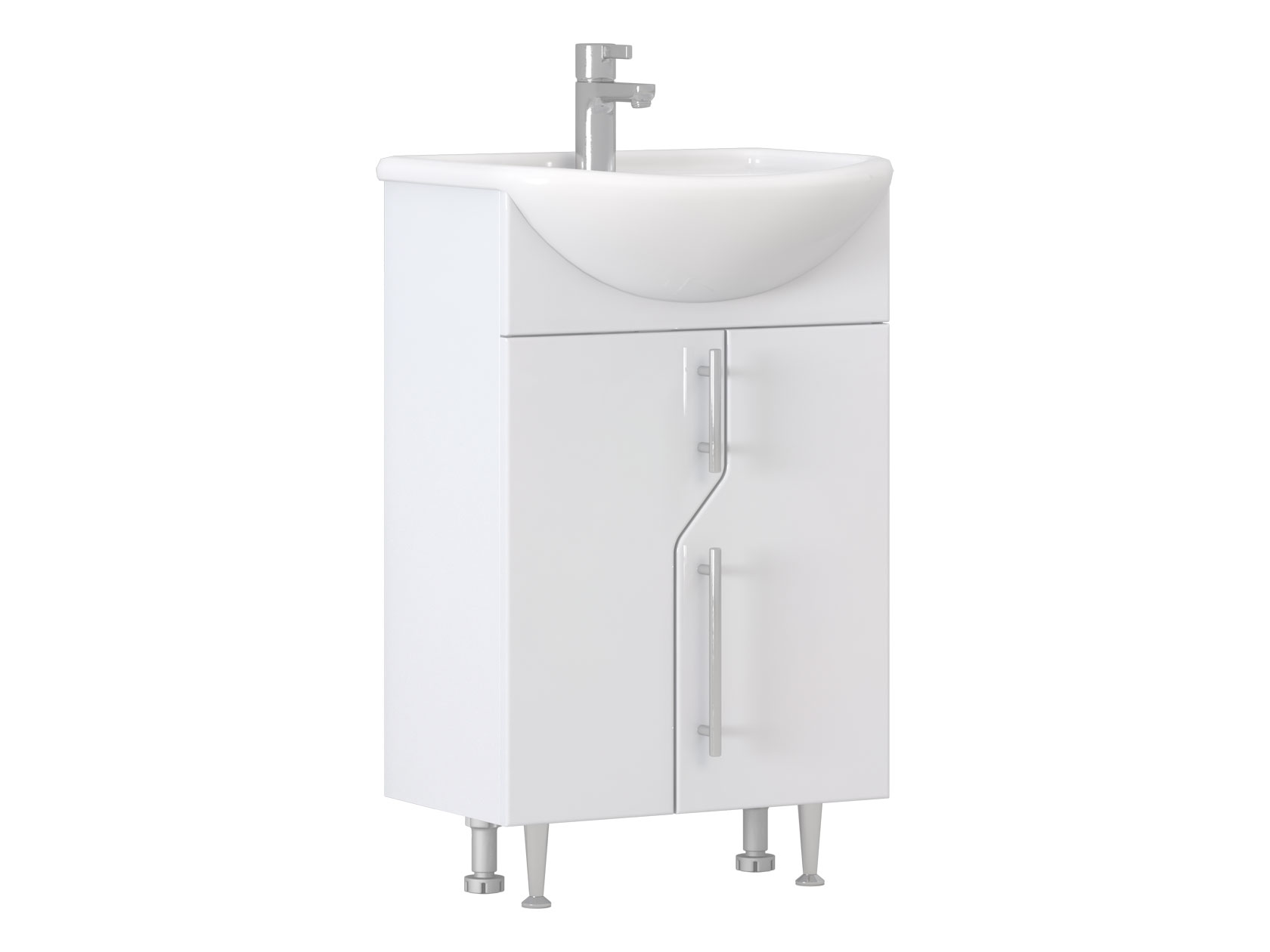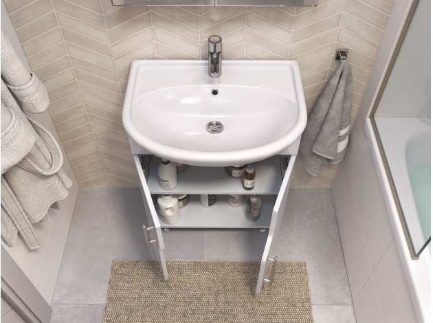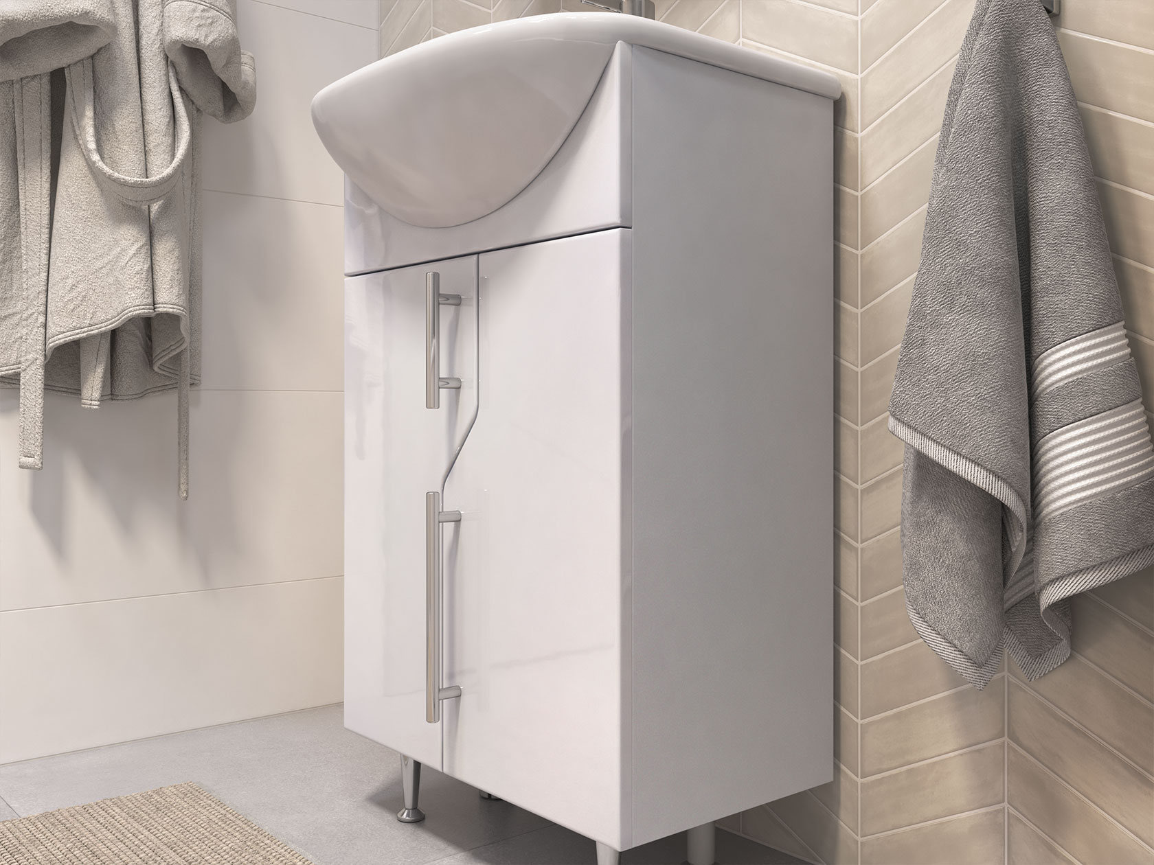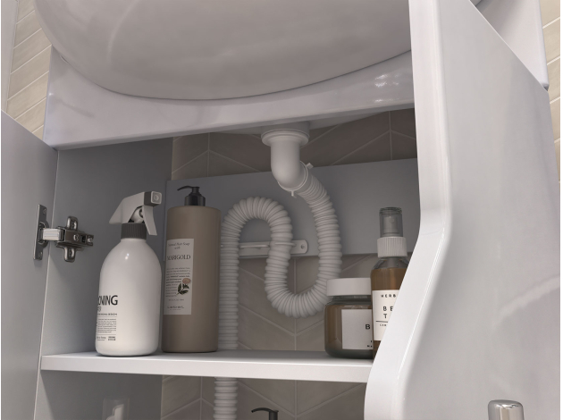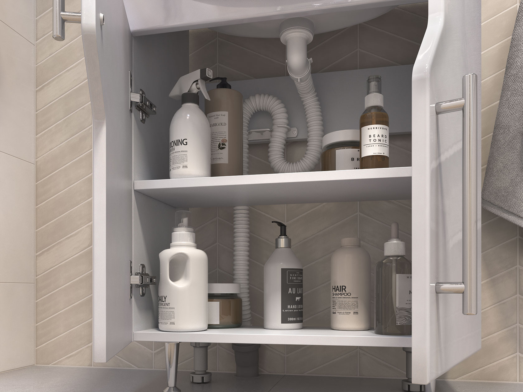 Тумба под раковину Турин поможет поддерживать порядок в ванной комнате. Отделение с полкой обеспечит удобное хранение полотенец, средств гигиены и бытовой химии. Дверцы необычной формы с продолговатыми ручками добавят пространству стиля и индивидуальности. Регулируемые опоры придают мебели устойчивость и визуальную легкость.