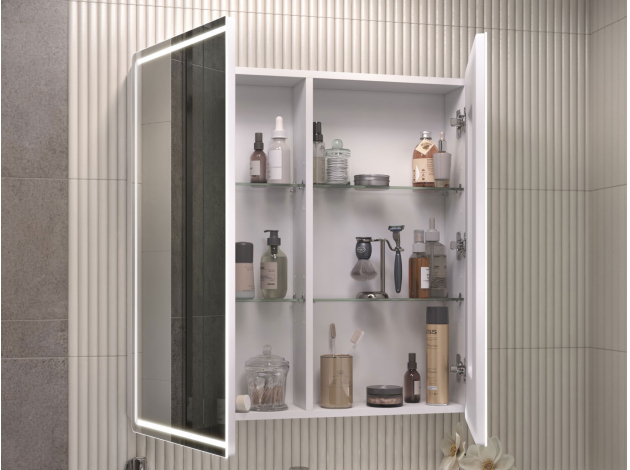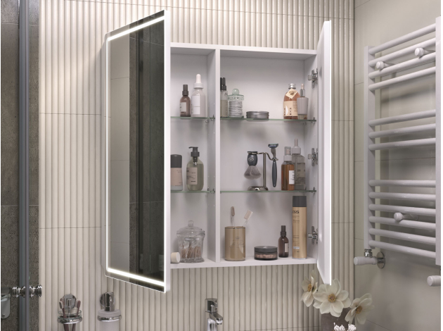 • Зеркальный шкаф LED Геометрия — практичное решение для современной ванной комнаты. Зеркальная дверца и встроенная LED-подсветка добавляют удобства эксплуатации. Внутри расположены полки, которые подходят для хранения косметики, средств гигиены и других необходимых мелочей. Влагостойкие материалы обеспечивают долговечность.